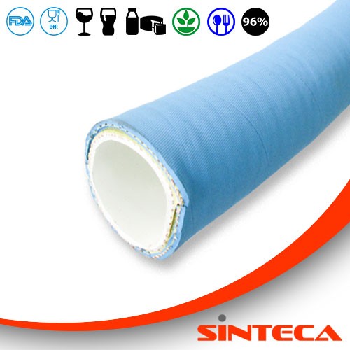 Milchsammelwagen- und Lebensmittelschlauch mit hochzähen, synthetischen Gewebeeinlagen und 2 Stahldrahtspiralen, NR-Gummi-Seele (weiß, glatt, Lebensmittelqualität) und abriebfester, ozonbeständiger EPDM-Decke.