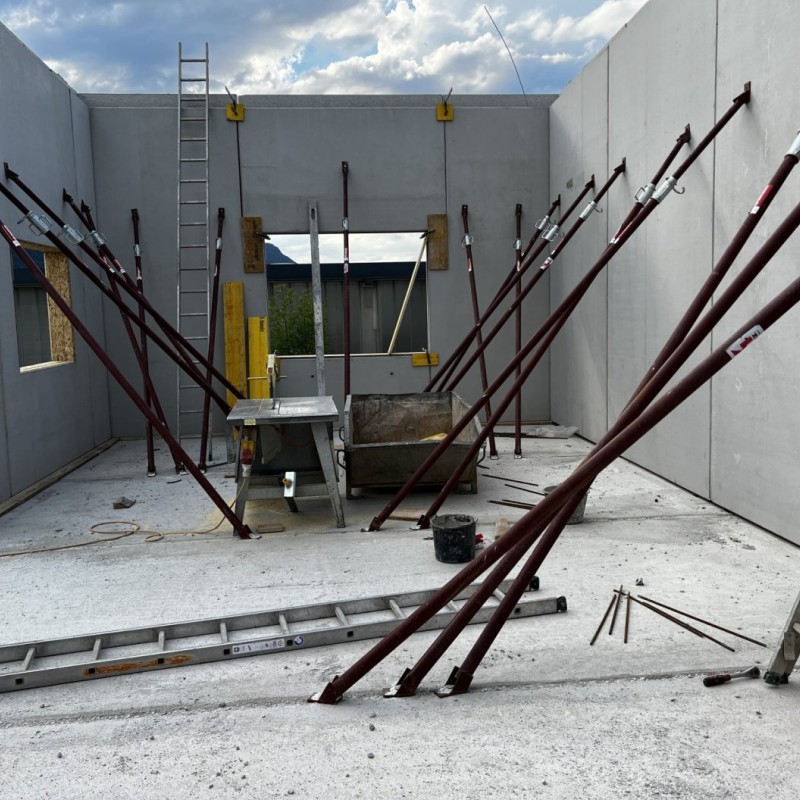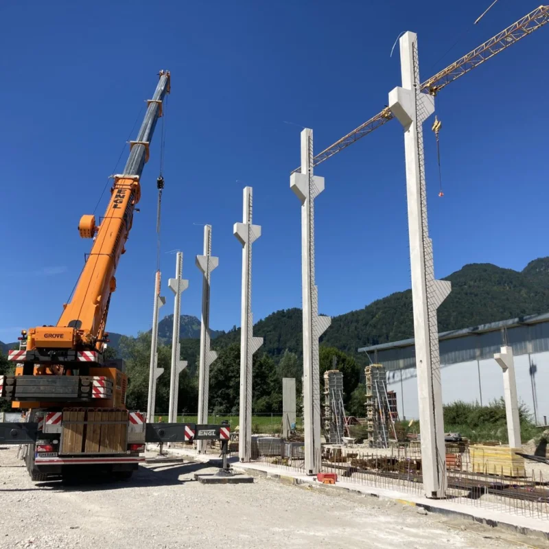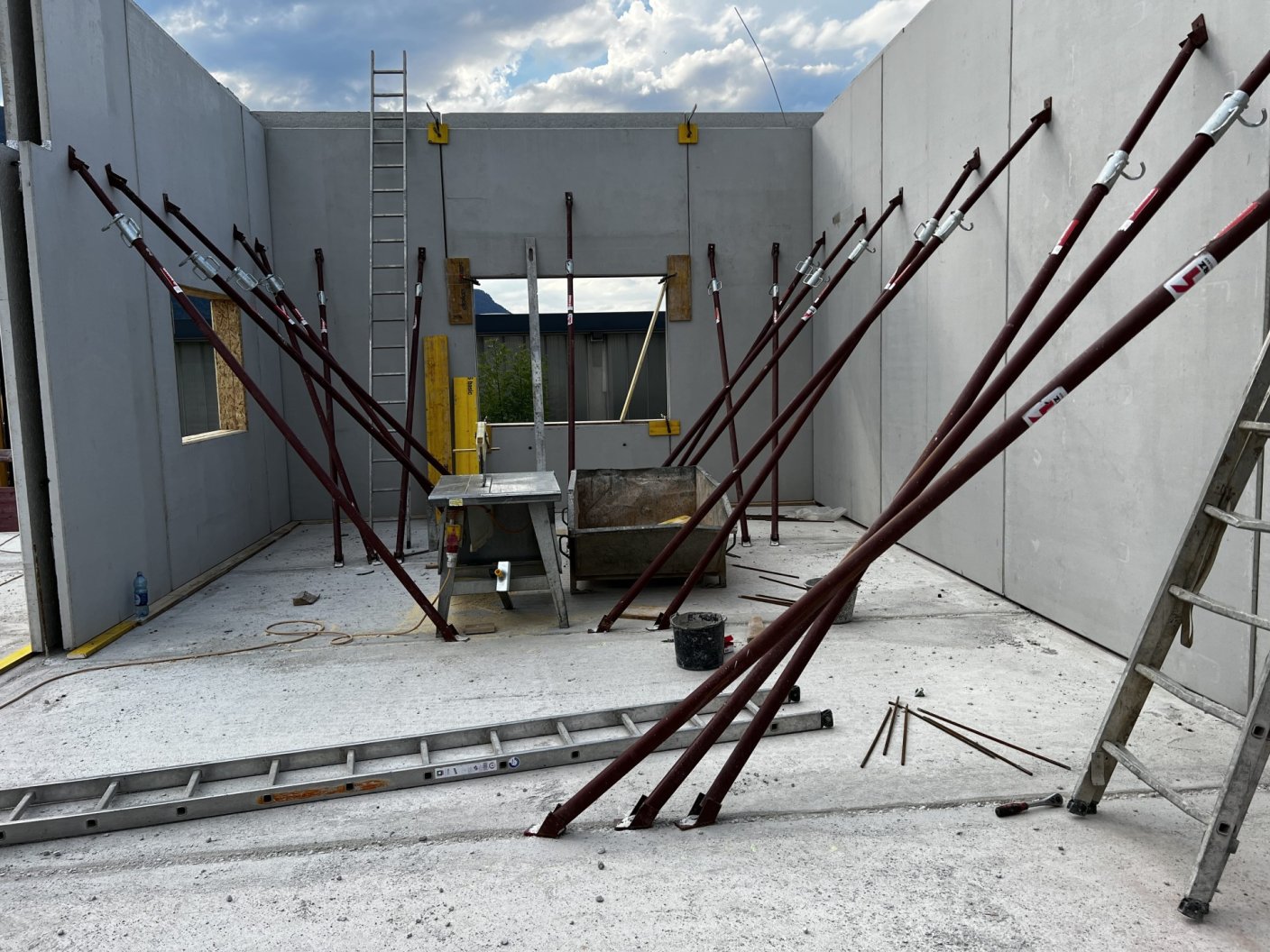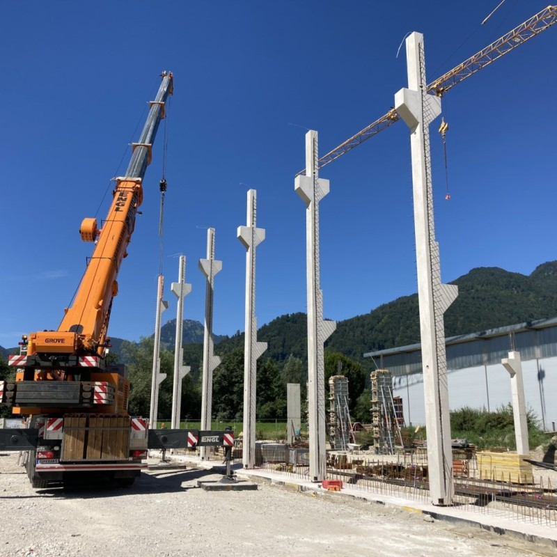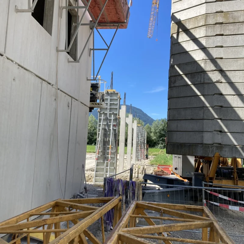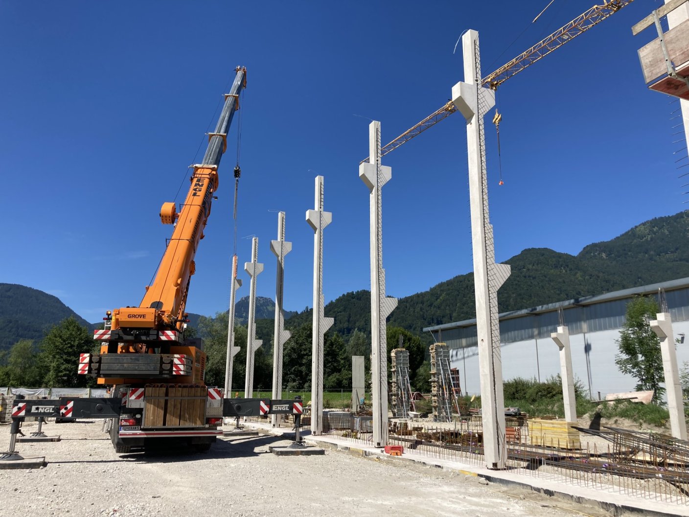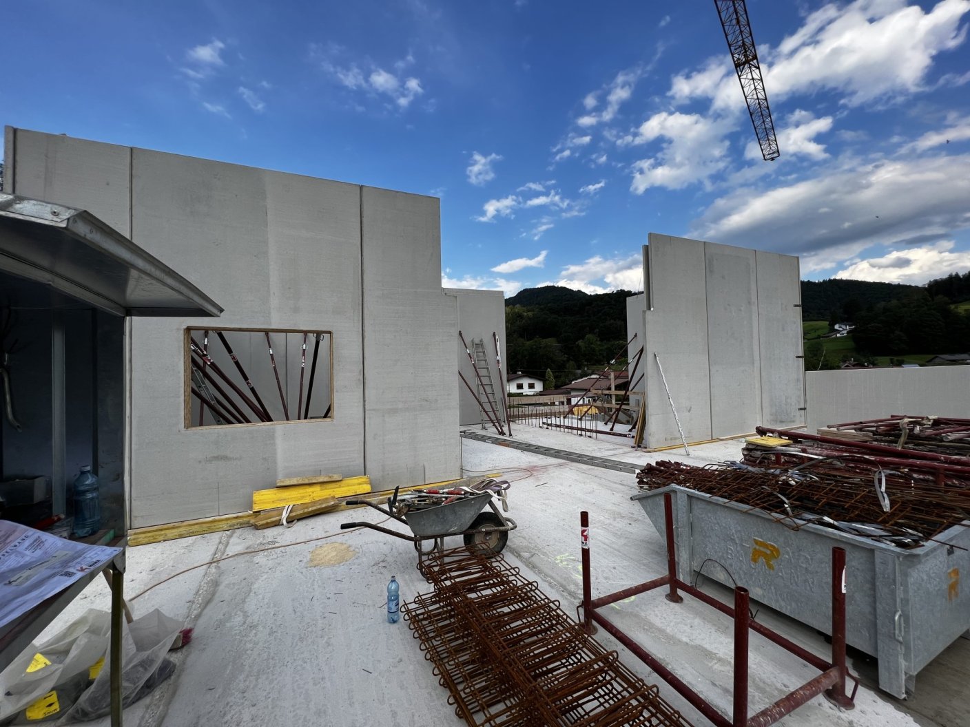 Seit Mitte Juni geht es weiter mit den Betonarbeiten. Aktuell wird das OG2 im Bürotrakt betoniert bzw. die Schalungen für die Betonaussensäulen vorbereitet.