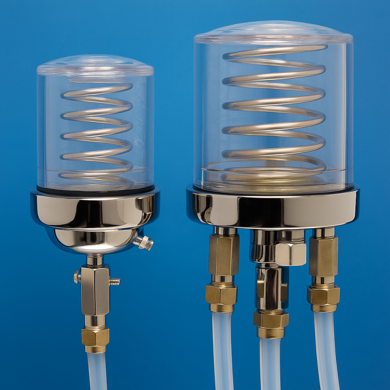 Für einfache Anwendungen geeignet. Diese Schmierstoffgeber drücken das genau dosierte Fett per Spiralfeder aus dem nachfüllbaren Behälter für eine wartungsfreie Langzeitschmierung. Durch einen Einfüllstutzen wird der Behälter mit einer normalen Fettpresse gefüllt. Die Dosierung wird durch einen Hahn am Schmierstoffgeber eingestellt. Durch das transparente Gehäuse lässt sich der Stand des Inhalts jederzeit kontrollieren. Damit ist die rechtzeitige Nachfüllung gewährleistet. Die Schmierstoffgeber selbst sind wartungsfrei, da keine Ersatz- oder Austauschteile benötigt werden.
