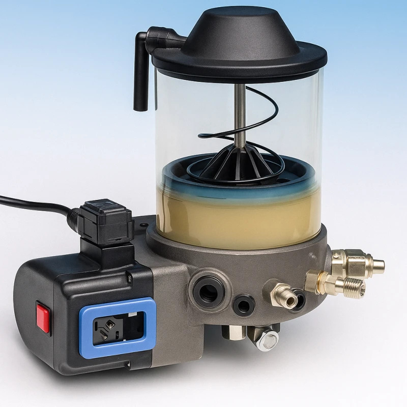 Die Ausstattung dieser kompakten Zentralschmieranlage als Mehrleitungs-Aggregat ist für sehr vielseitigen Einsatz vorbereitet. Verschieden dimensionierte Anschlüsse für fünf wählbare Pumpenelemente versorgen bis zu acht Schmierstellen direkt. Gleichzeitig können noch zwei weitere Pumpenelemente Schmierfette an Progressivverteiler fördern.