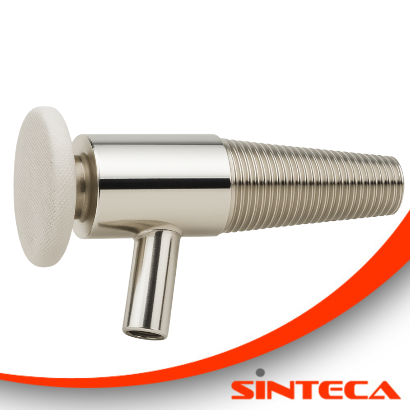 Kosthahn mit Handrad mit speziellem Anschluss für Barriquefässer: der Anschluss in konischer Form mit Gewinde erleichtert das direkte Eindrehen in das Holz.