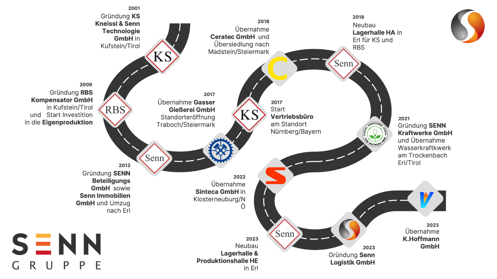 Das Schaubild zeigt die Geschichte der SENN Gruppe. 2001 wurde das Unternehmen von Franz Senn sen. in Kufstein gegründet. Seitdem sind über die Jahre verschiedene Unternehmen in der Gruppe dazugekommen. 2023 stellt das Highlight der Bezug der neuen Lager- und Produktionshalle in Erl, Mühlgraben 43e dar. Damit ist der Platz für weiteres Wachstum geschaffen.